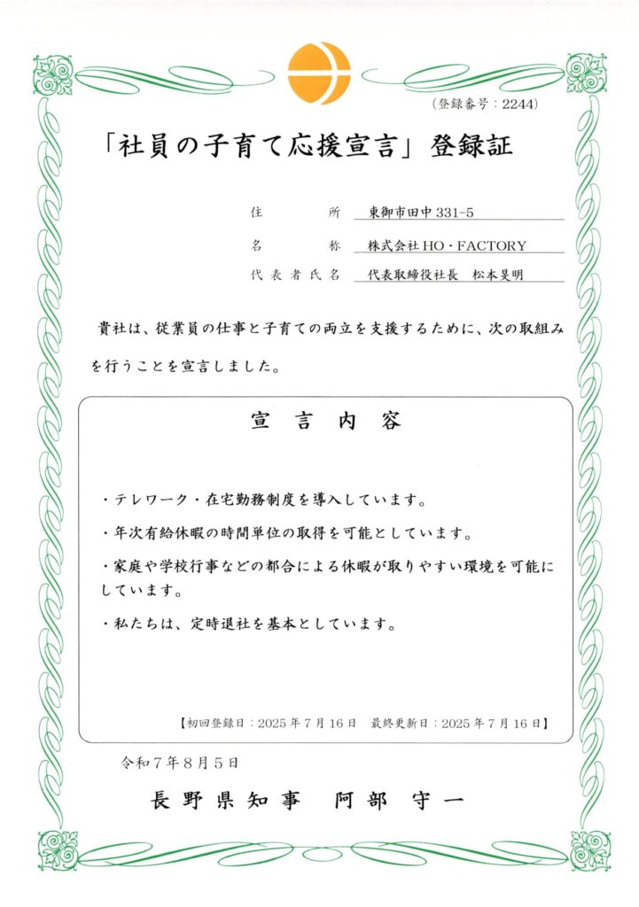 社員が仕事と子育てを両立できるよう、積極的に支援する企業であることを宣言しました。